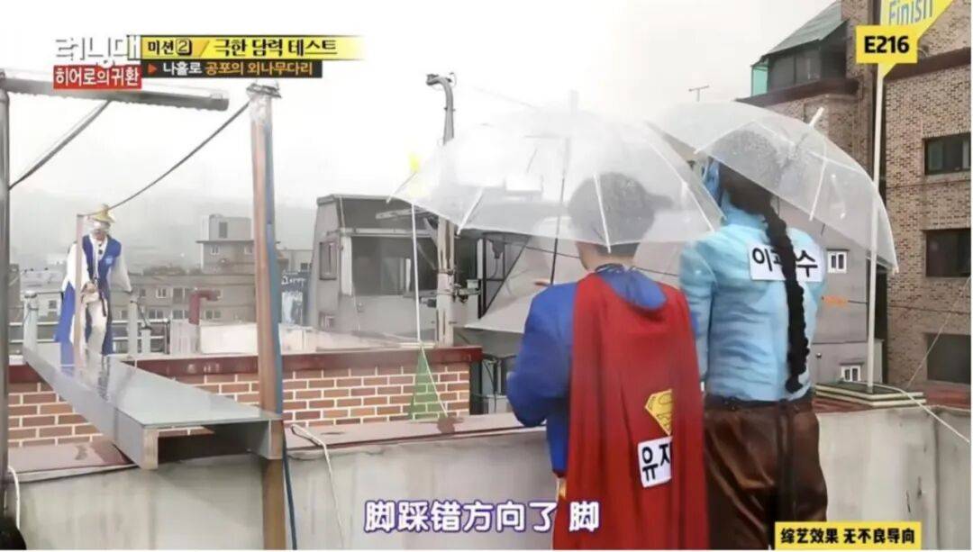 韩版《Running Man》的游戏设计以户外竞技为核心,经过多轮版本迭代后,形成了“街头任务 捉迷藏 撕名牌”的复合结构,制作组刻意留出规则空白,让成员的临场发挥和即兴互动成为看点。例如“高空整蛊”游戏,在两栋楼间架起一个独木桥,让嘉宾以为在高空行走,实则仅距离地面半米,以达成整蛊的目的。李光洙HAHA在进行任务时双腿发软、表情失控的真实惊吓反应,搭配队友的起哄,即兴搞笑效果拉满。